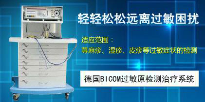 郑州肤康皮肤病研究所引进了世界较的过敏性疾病检测与治疗设备——德国BICOM过敏原检测治疗系统。该仪器是集检测过敏原,调节机体平衡为体的自然诊疗系统。随机配备近500种实物过敏原,其中涵盖基础过敏原样本、花粉过敏原样本、吸入性过敏原样本、接 触性化学物质过敏原样本、食品添加剂过敏原样本,并能据受检者的实际情况无限量扩大检测范围,适应病症广,检测时间短,有效率高,为患者提供种无创,无痛,无需药物,无依籁性的新的检测治疗方法。