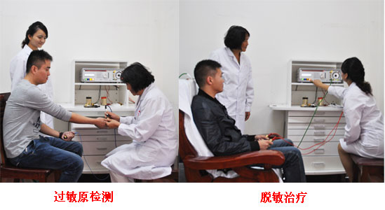 使用生物共振技术,将致敏信号收集,通过同步镜像转换,逆转过敏原信息,然后通过设备进行放大,重新输入人体,将人体内异形波恢复为正常波形,从而使人体恢复正常。