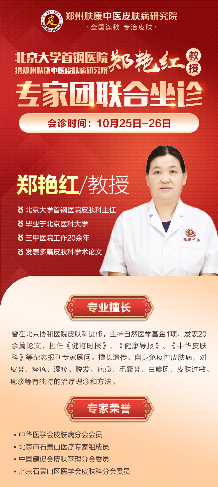 重磅消息:10月25至26,北京大学首钢医院皮肤科郑艳红教授,莅临郑州肤康中医皮肤病研究院开展为期两天的名医联合会诊活动!此次活动由肤康•中国牵头,郑州肤康中医皮肤病研究院承办,旨在帮助广大疑难皮肤病患者解决“看病难、看名医更难”的烦恼。