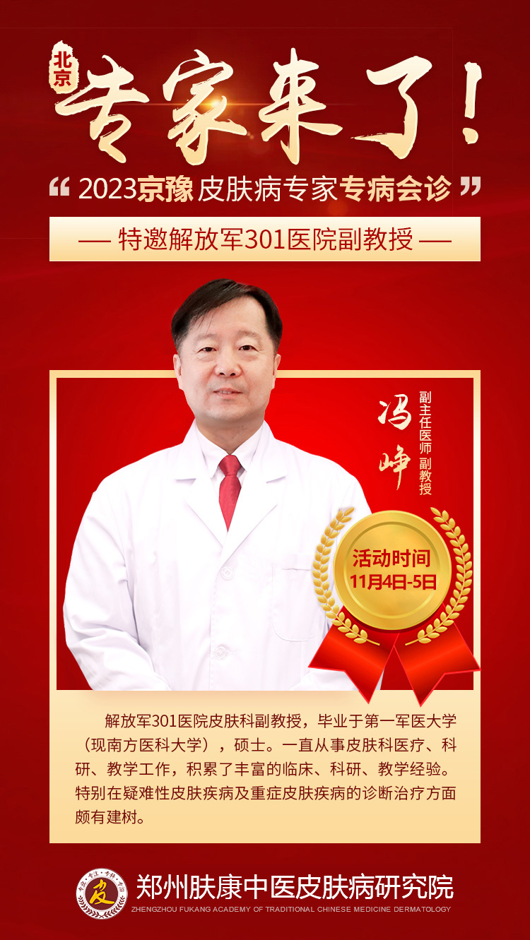 2023京豫皮肤病专家专病会诊!解放军301医院冯峥副教授于2023年11月4-5日(两天),莅临郑州肤康皮肤病医院亲诊,由于专家号比较紧张,考虑到会诊质量,严格控制就诊人数,会诊期间专家号每日限20个,预约抓紧!