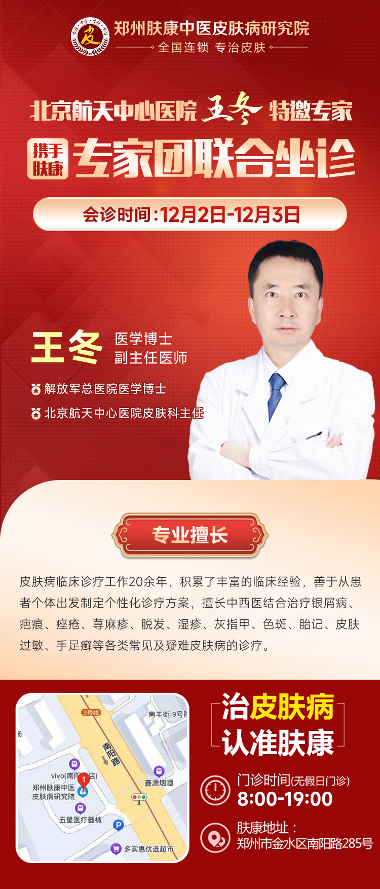 12月2日-3日,郑州肤康皮肤病医院将邀王冬副主任医师进行会诊