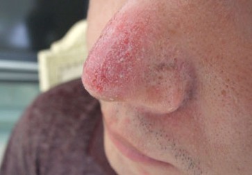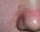 酒糟鼻多见于中年人,女性多于男性,但男性患者病情较重,皮损好发于面部中央,对称分布。常见于鼻部,两颊,眉间,颏部。主要症状有鼻子潮红,表面油腻发亮,持续存在伴有瘙痒、灼热和疼痛感。酒糟鼻早期鼻部出现红色的小丘疹、丘疱疹和脓疱,鼻部毛细血管充血严重,肉眼可见明显树枝状的毛细血管分支,较终鼻子上出现大小不等的结节和凹凸不平的增生,鼻子肥大不适,严重影响患者的美观。